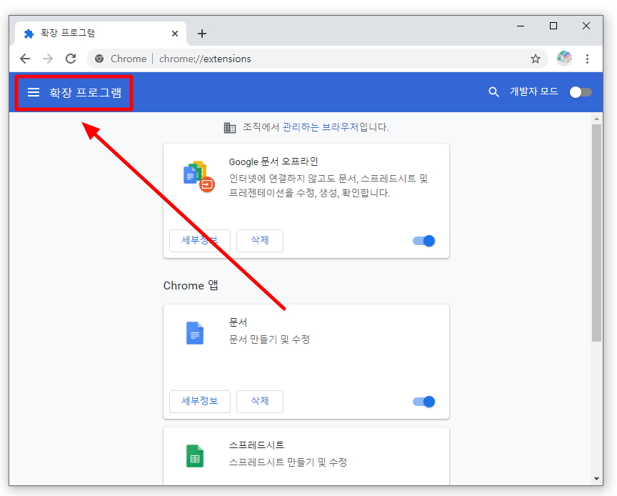 2. 확장 프로그램에서 좌측 상단 三 메뉴를 클릭해 주세요.