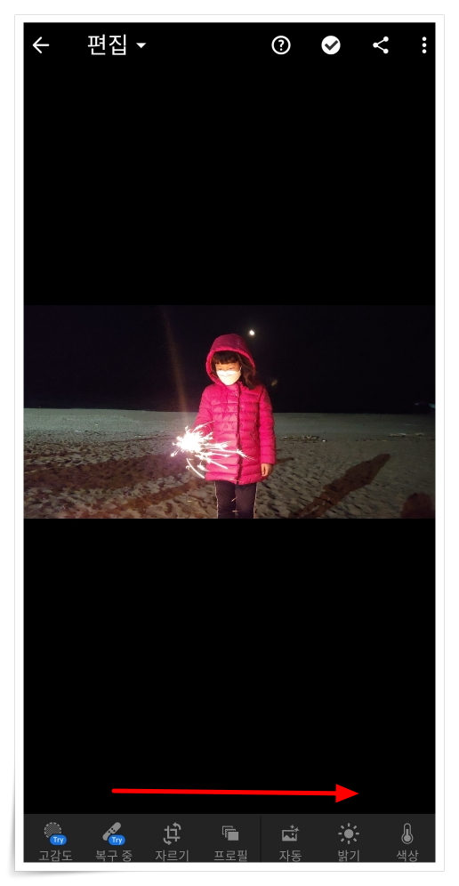 2. 불러 온 사진을 선택하면 편집이 시작됩니다. 하단 편집 메뉴를 우측으로 밀어 주세요.