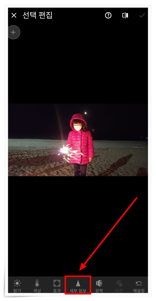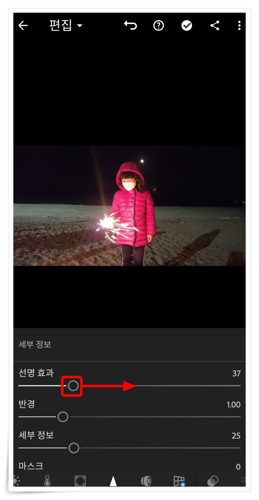 4. 세부 정보에서 "선명 효과" 바를 밀어서 수치를 조금씩 올려 주세요. 이미지를 꾹 누르면 효과 적용 전/후 모습을 빠르게 확인하실 수 있습니다.