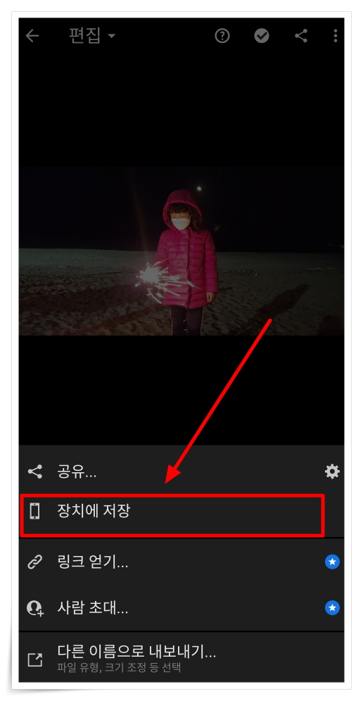 6. 장치에 저장을 클릭하면 스마트폰에 편집된 사진이 저장됩니다.