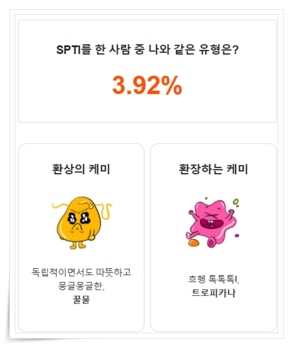 ▼ 결과 유형에 어울리는 환상의 케미, 환장의 케미를 확인할 수 있고 결과 값을 SNS을 통해 공유할 수 있어요.