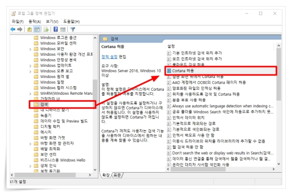 3. "Windows 구성 요소"에서 "검색"을 찾아 우측 "Cotana 허용"을 클릭해 주세요.