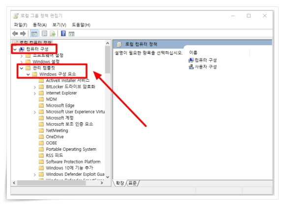 2. 로컬 그룹 정책 편집기에서 "컴퓨터 구성" > "관리 템플릿" > "Windows 구성 요소"을 클릭해 주세요.