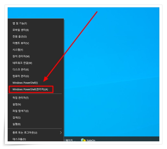 1. 단축키 "윈도우키 + X"을 클릭 후 "Windows PowerShell(관리자)을 클릭해 주세요.