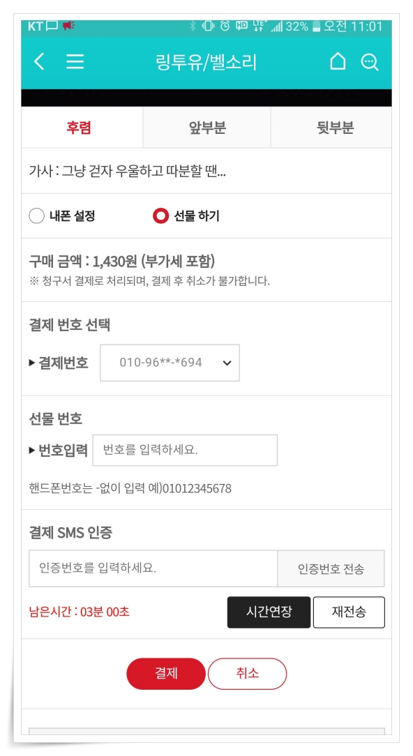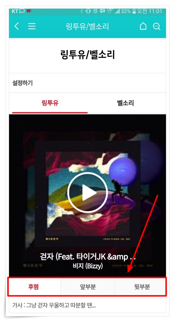 만약 기본 연결음이 마음에 안 든다면 유료로 인기 있는 곡으로 변경할 수 있어요. 후렴, 앞부분, 뒷부분 등 노래의 원하는 부분을 선택해서 설정할 수 있습니다.
