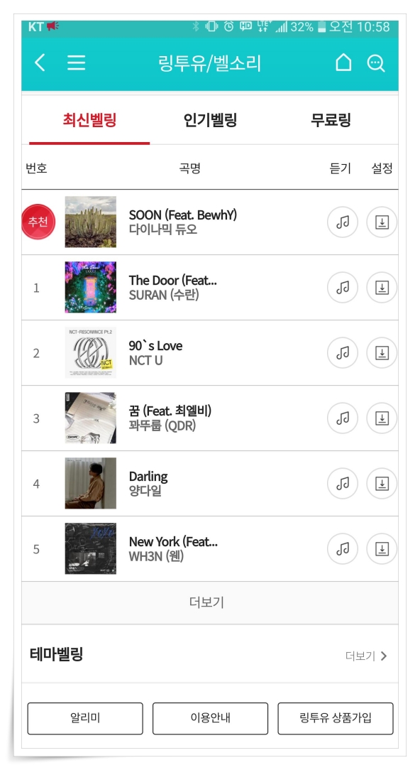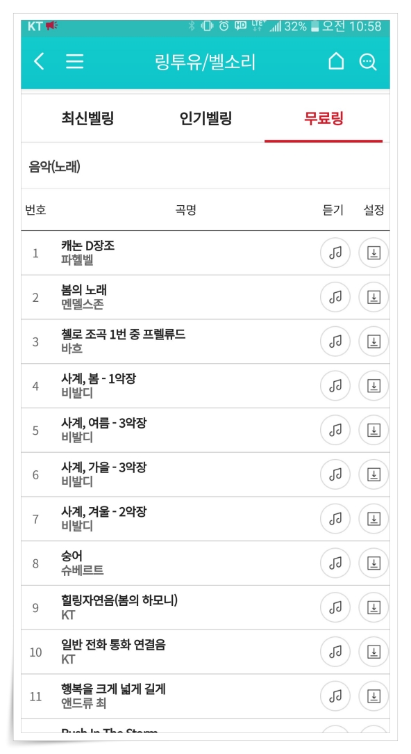 ▼ 링투유에는 최신벨링, 인기벨링, 무료링 등 다양한 곡을 선택하실 수 있습니다. 무료로 컬러링을 교체하려면 "무료링"에서 노래를 선택하시면 되세요.