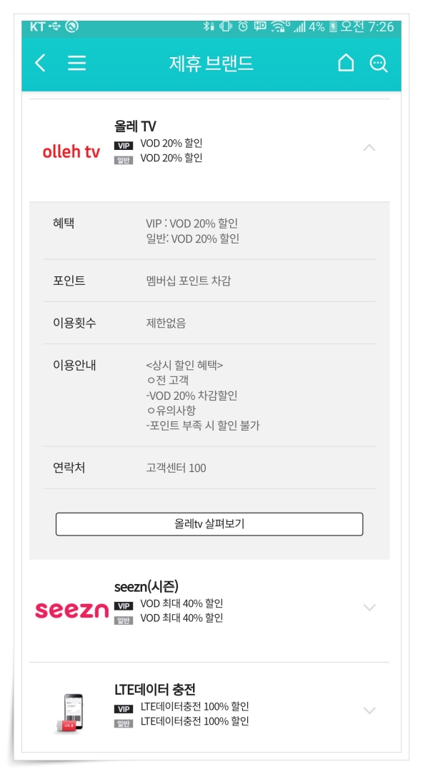 ▼ 그리고 올레TV VOD 20%할인, 버거킹 버거콤보 44% 할인, LTE데이터 100% 충전도 이용하실 수 있습니다.