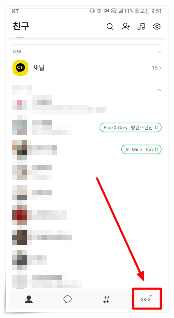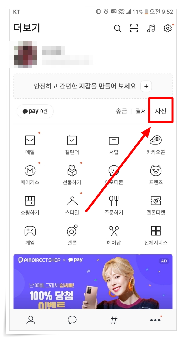 ▼ 카카오톡 실행 후 우측 하단 점 3개 모양의 "더보기" 메뉴에서 "자산"을 클릭해 주세요.