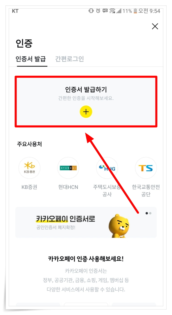 ▼ 카카오페이 "인증"에서 "인증서 발급하기"을 클릭해 주세요.