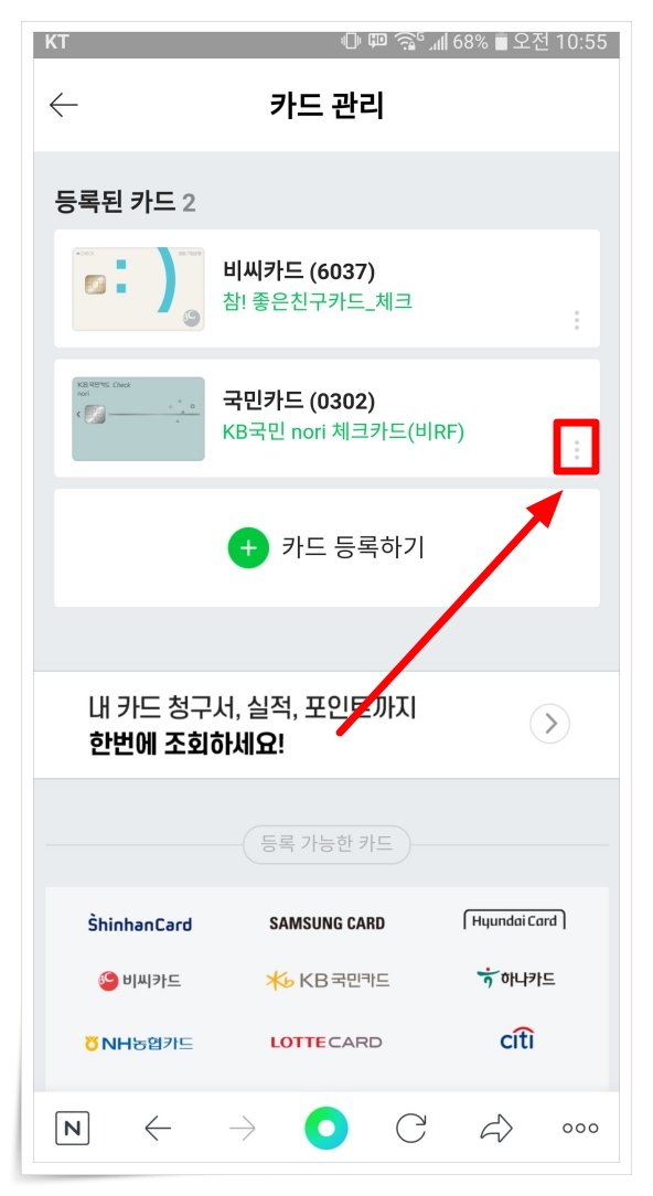 ▼ 관리페이지에서 등록된 카드 우측에 있는 점 3개 메뉴를 클릭해 주세요.