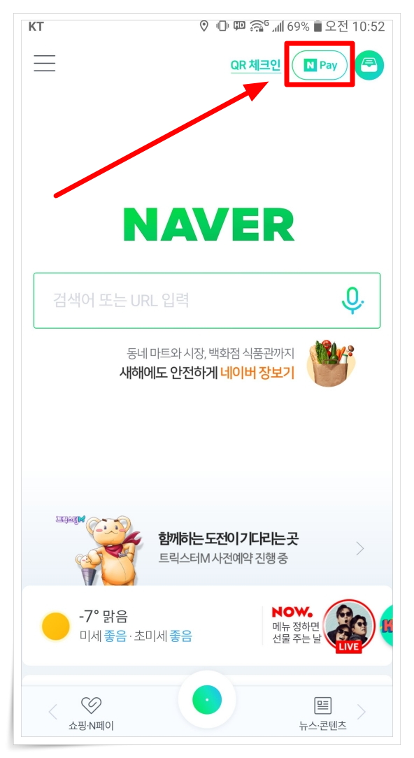 ▼ 네이버 앱 실행 후 우측 상단 "NPAY"을 클릭해 주세요.
