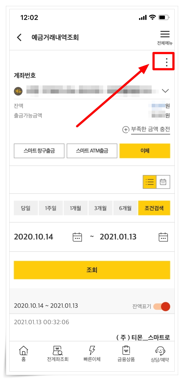 ▼ 예금거래내역조회 우측에 있는 "점 세개 아이콘"에서 "통장사본보기"을 클릭해 주세요.