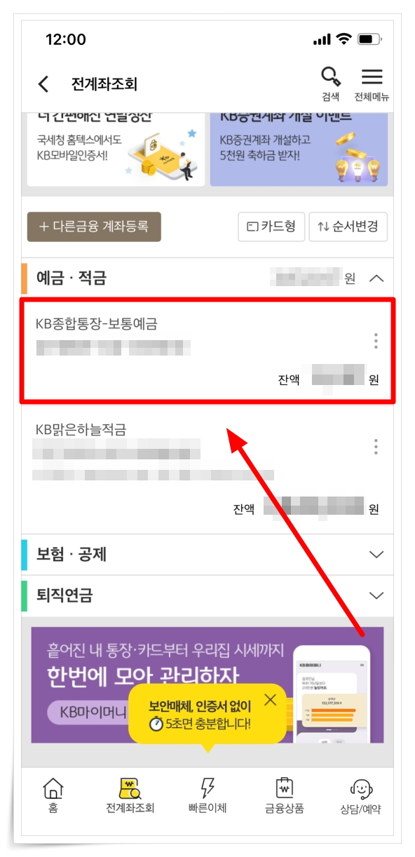 ▼ KB스타뱅킹 앱 실행 후 하단 "전계좌조회"에서 개설된 예금, 적금을 선택해 주세요.