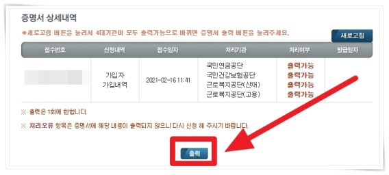▼ 처리여부에 출력가능이 나오면 "출력"을 클릭해 주세요. 만약 출력가능이 나오지 않았다면 "새로고침"을 클릭해 주세요.