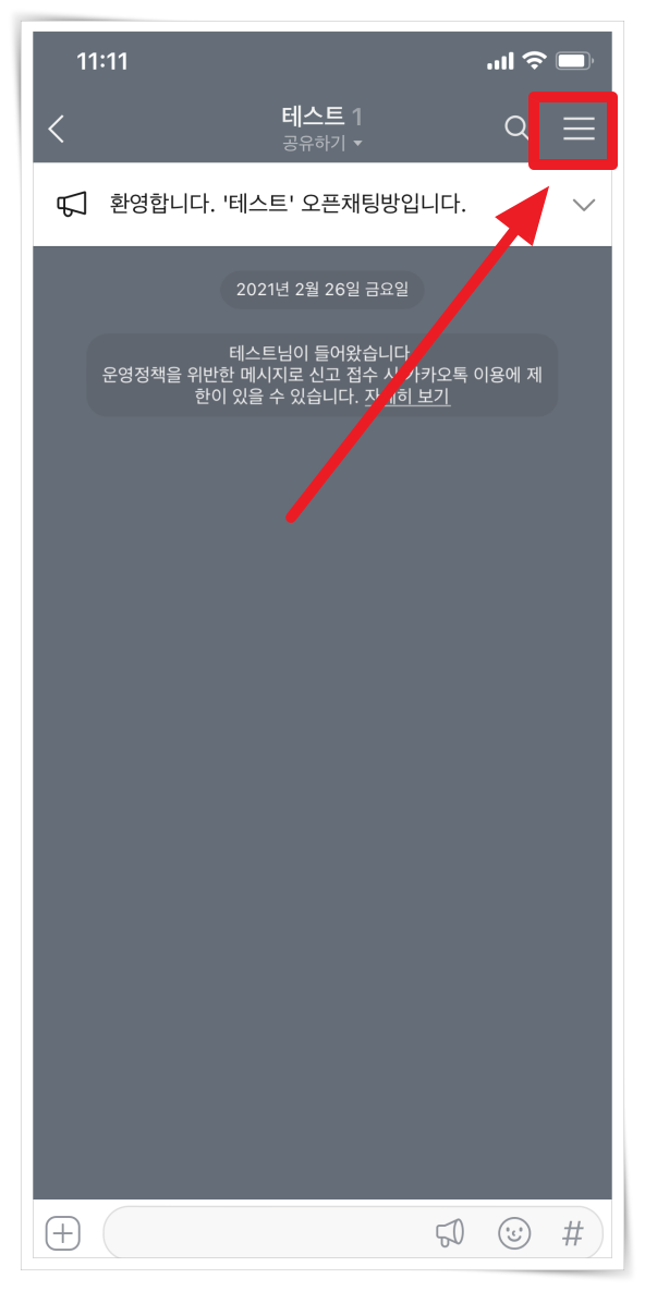 ▼ 그룹채팅방 이름을 입력 후 우측 상단 三 메뉴를 클릭해 주세요.