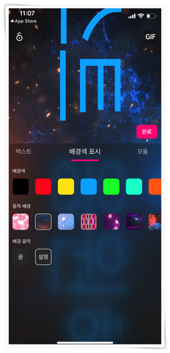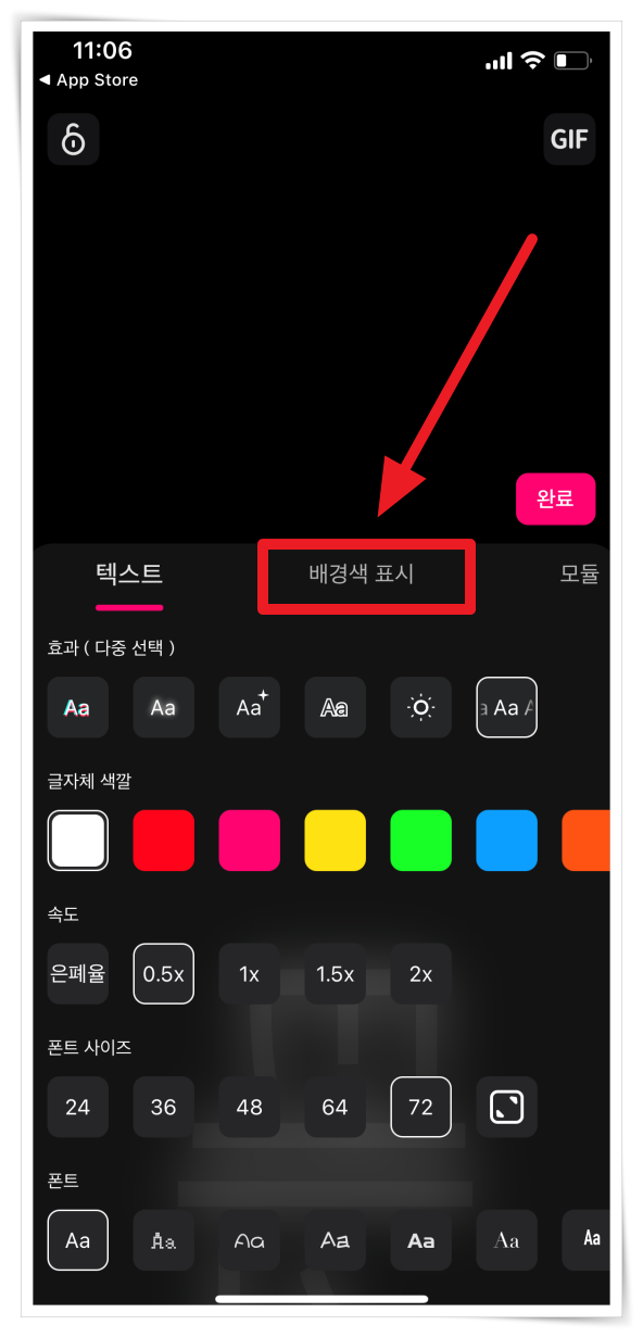 ▼ 편집도구에는 효과, 글자체, 속도, 크기 등 다양한 편집이 가능합니다. 그리고 "배경색 표시" 탭을 클릭하면 화려한 애니메이션 배경을 삽입할 수 있어요.