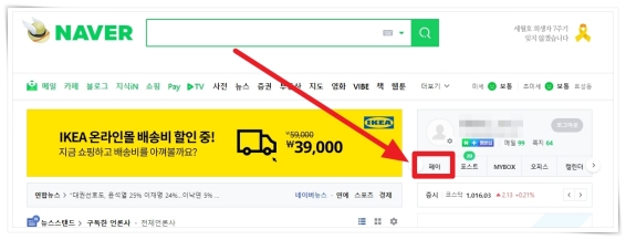 ▼ 네이버 로그인 후 프로필 창 아래에 "페이" 메뉴를 클릭해 주세요.