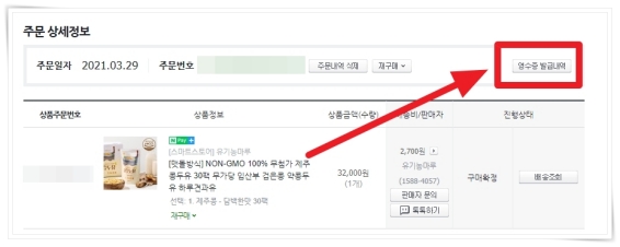 ▼ 주문 상세정보 우측에 있는 "영수증 발급내역"을 클릭해 주세요.