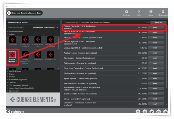 ▼ 좌측에서 CUBASE ELEMENTS 11을 선택 후 우측에서 필요한 프로그램을 설치해 주세요. Application만 설치하셔도 됩니다.