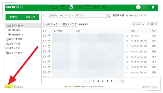 ▼ 카페에 대한 쪽지를 모두 차단하려면 왼쪽 하단 "환경설정"을 클릭해 주세요.