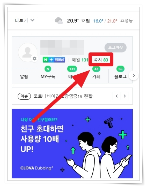 ▼ 네이버 홈페이지 로그인 후 프로필 메뉴에서 "쪽지"을 클릭해 주세요.
