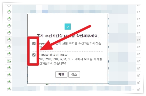▼ 수신차단 대상에서 카페와 보낸 아이디 모두 체크 후 "확인"을 누르면 됩니다.