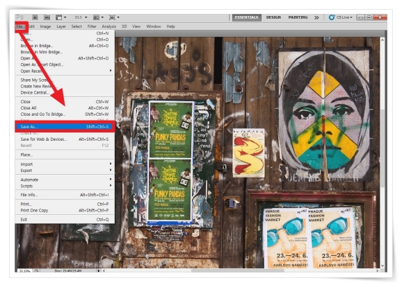 ▼ 포토샵에서 파일을 열고 상단 "FILE" > "SAVE AS" 메뉴를 클릭해 주세요.