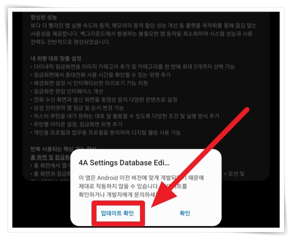 1. 앱 실행 후 안드로이드 버전이 낮으면 실행이 안될 수 있습니다. "업데이트 확인"을 클릭해 주세요.