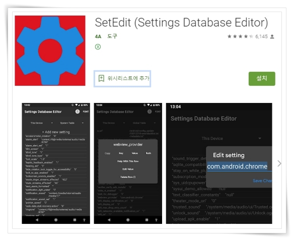 설정 편집기 앱은 안드로이드 데이터베이스를 편집하여 설정을 변경할 수 있도록 도와주는 어플입니다. 카메라 촬영음을 변경하여 진동 또는 무음에서만 소리가 안나도록 설정할 수 있습니다. 먼저 구글플레이스토어에서 앱을 설치해 주세요. (바로가기)