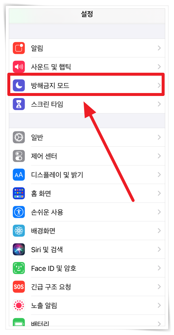 1. "설정" > "방해금지 모드"를 클릭해 주세요.