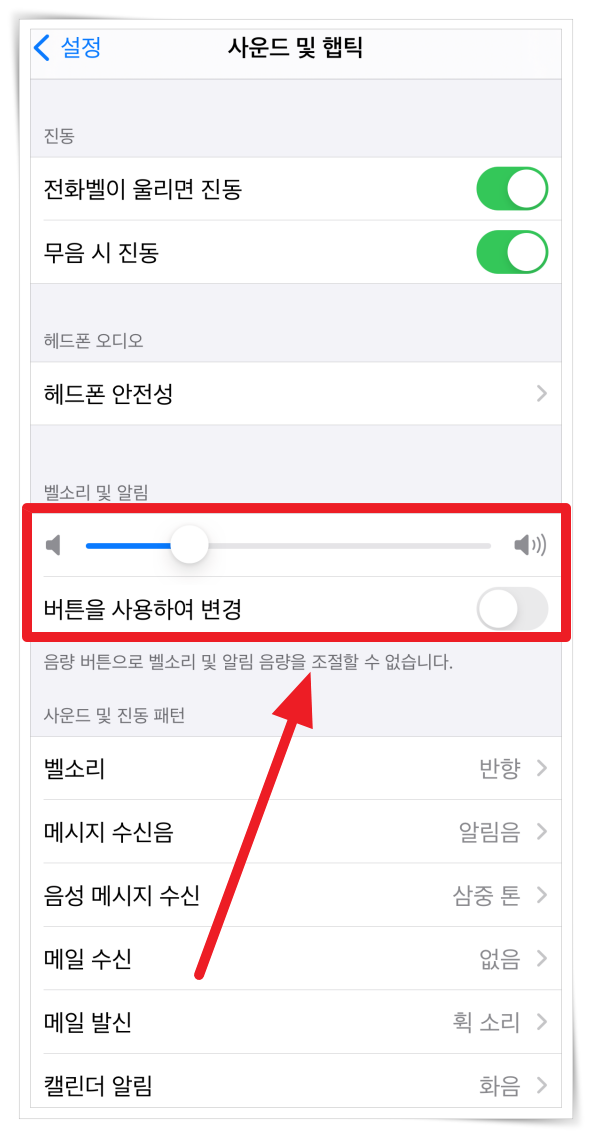 사운드 및 햅틱 설정은 최저 음량으로 설정해도 알림이 안 울리는 건 아니지만 소리가 작다면 잠결에 못 들을 가능성이 크겠죠? 음량을 올려서 알람음이 잘 들리도록 설정해 보세요.