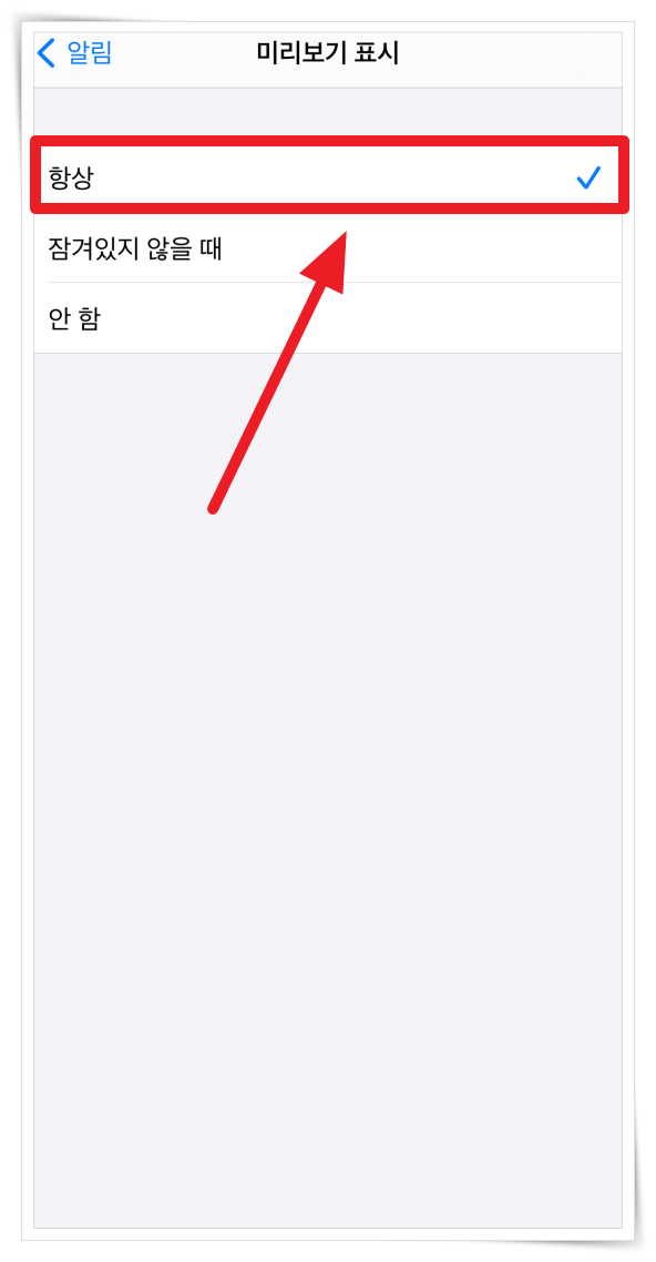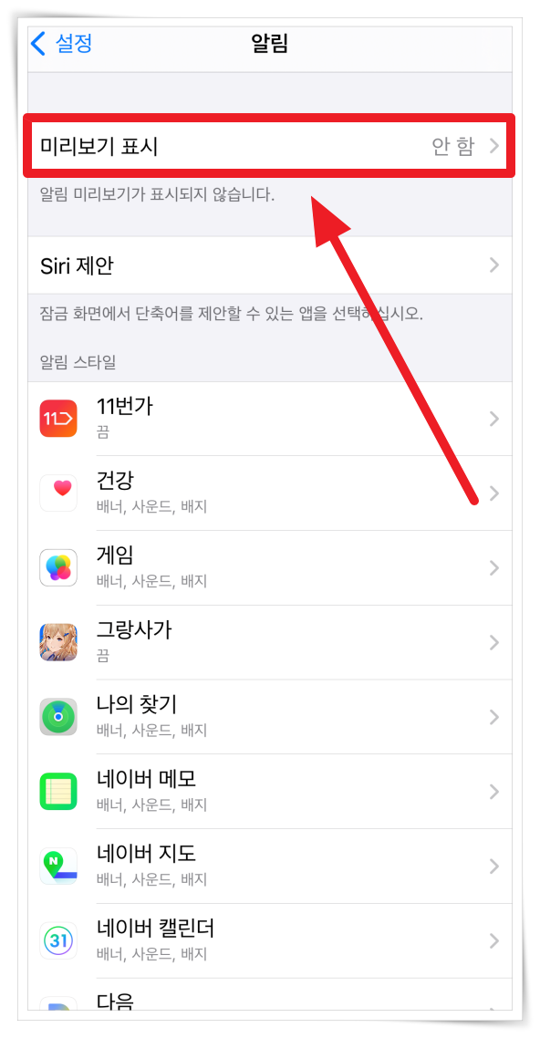 알림이 미리보기에 표시 안되면 알람이 울린지 모를 경우가 발생할 수 있습니다. 알림 미리보기가 사용 안함으로 되어 있다면 허용해 주세요.