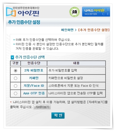 6. 추가 인증 수단 설정은 2차 비밀번호, 키패턴, 지문, APP OTP로 설정하실 수 있습니다.