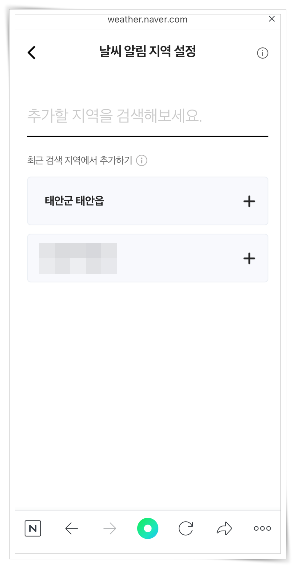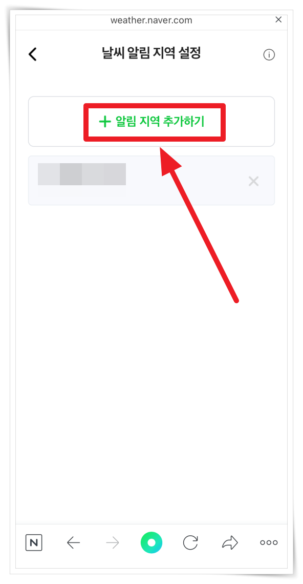 3. 날씨 알림 지역은 총 5개를 설정하실 수 있습니다. "알림 지역 추가하기"로 지역을 추가해 주세요.