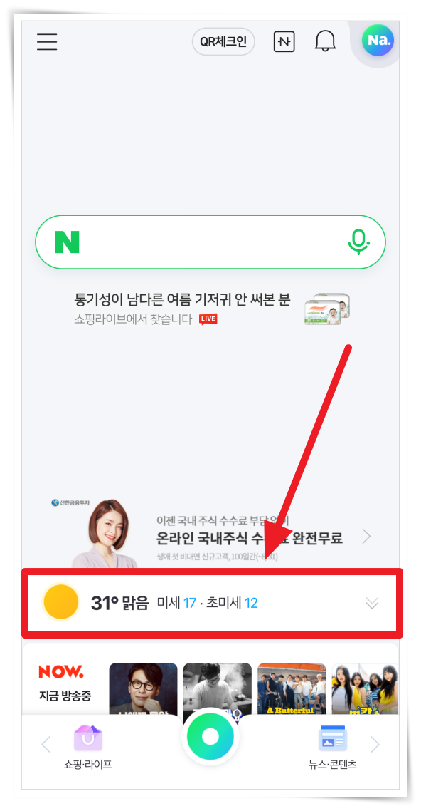 1. 네이버 앱 실행 후 홈화면 하단에 있는 "날씨정보"를 클릭해 주세요.
