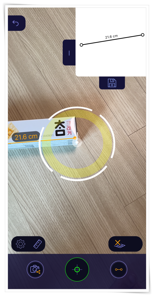 6. 측정하려는 대상의 시작점과 끝점을 클릭하여 길이를 재실 수 있습니다. 참 크래커의 길이는 21.6CM가 나왔는데요.