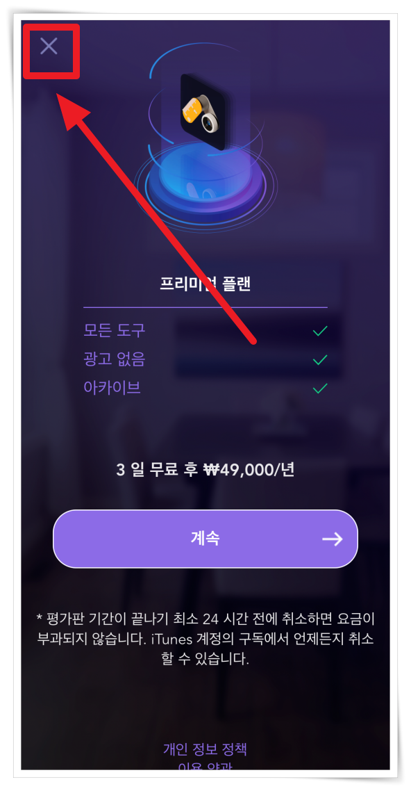 1. 앱을 실행하면 "프리미엄 플랜" 권유 화면이 나옵니다. 절대 다른 것을 누르지 말고 좌측 상단 "X"를 클릭해 주세요. 계속을 누르면 정기결제가 될 수 있습니다.