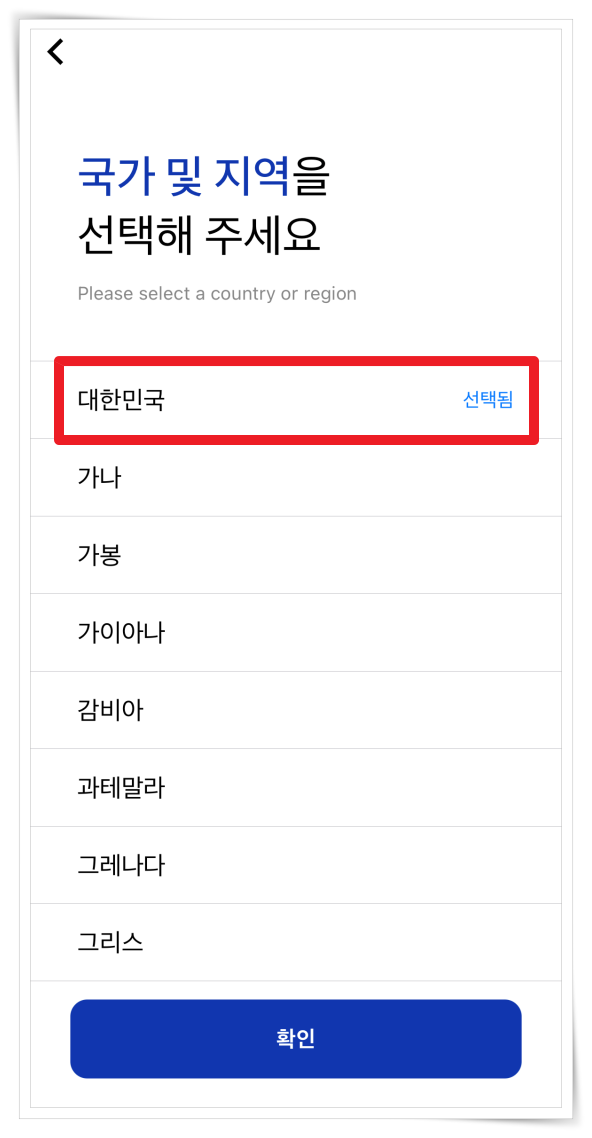 1. 앱 실행 후 언어 및 국가, 지역을 선택해 주세요.