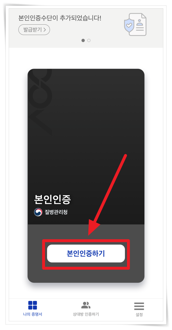 5. 본인인증 후 상단 "코로나19 예방접종증명서" 발급받기를 클릭하면 접종 확인을 하실 수 있습니다.