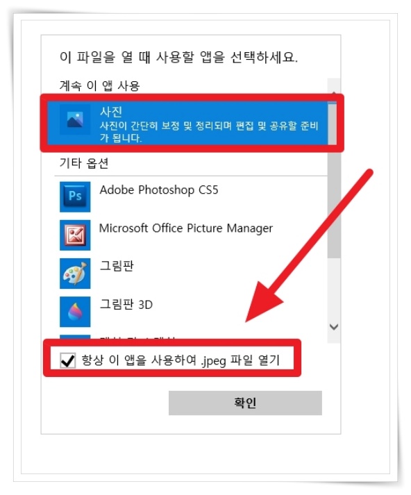 4. 파일을 열 때 사용할 앱을 "사진"을 선택 후 "항상 이 앱을 사용하여 파일 열기"를 체크하면 문제를 해결하실 수 있습니다.