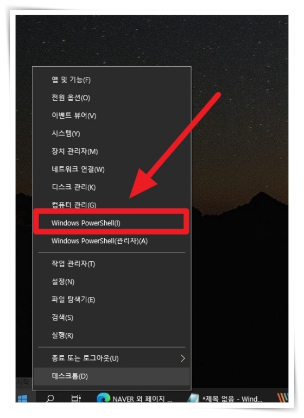 1. 윈도우 시작키에 마우스 우클릭 후 "Windows PowerShell"을 클릭해 주세요.