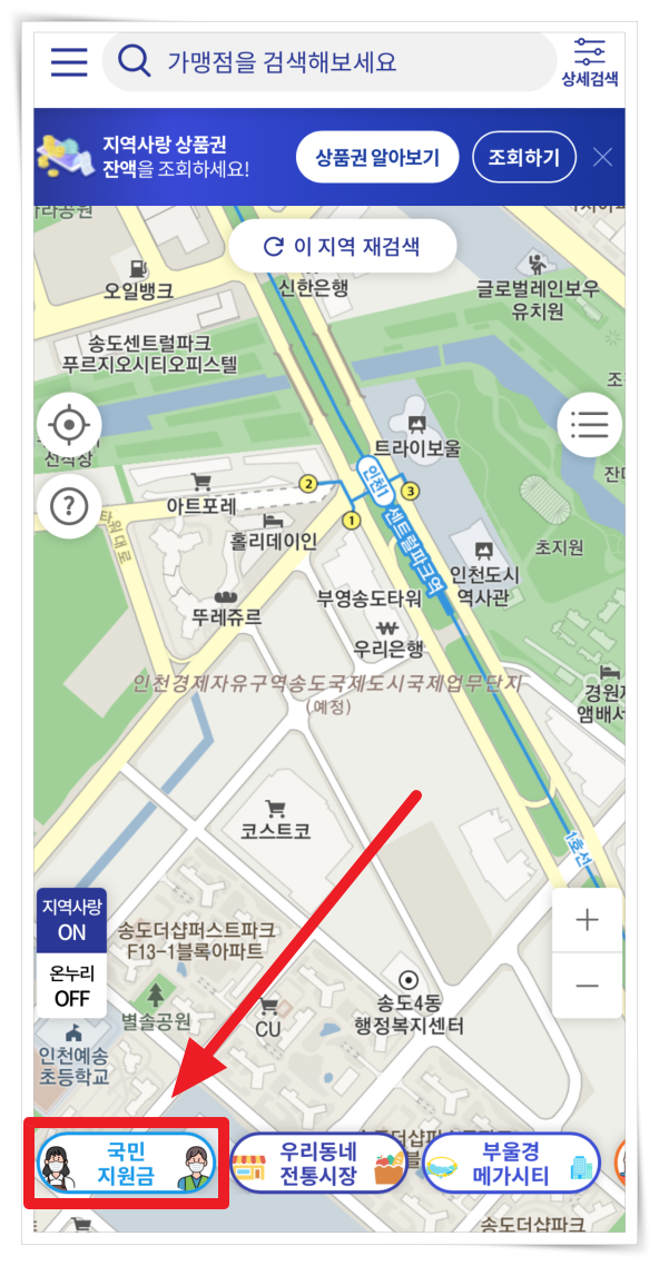 3. 지맵 도움말을 보면 국민지원금 표식을 확인하실 수 있어요. 지도 하단에 있는 "국민 지원금"을 체크해 주세요.