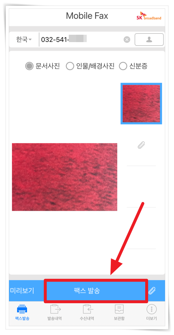 4. 이제 문서를 발송해 볼게요. 팩스번호, 문서를 입력 후 하단 "발송"을 클릭해 주세요.