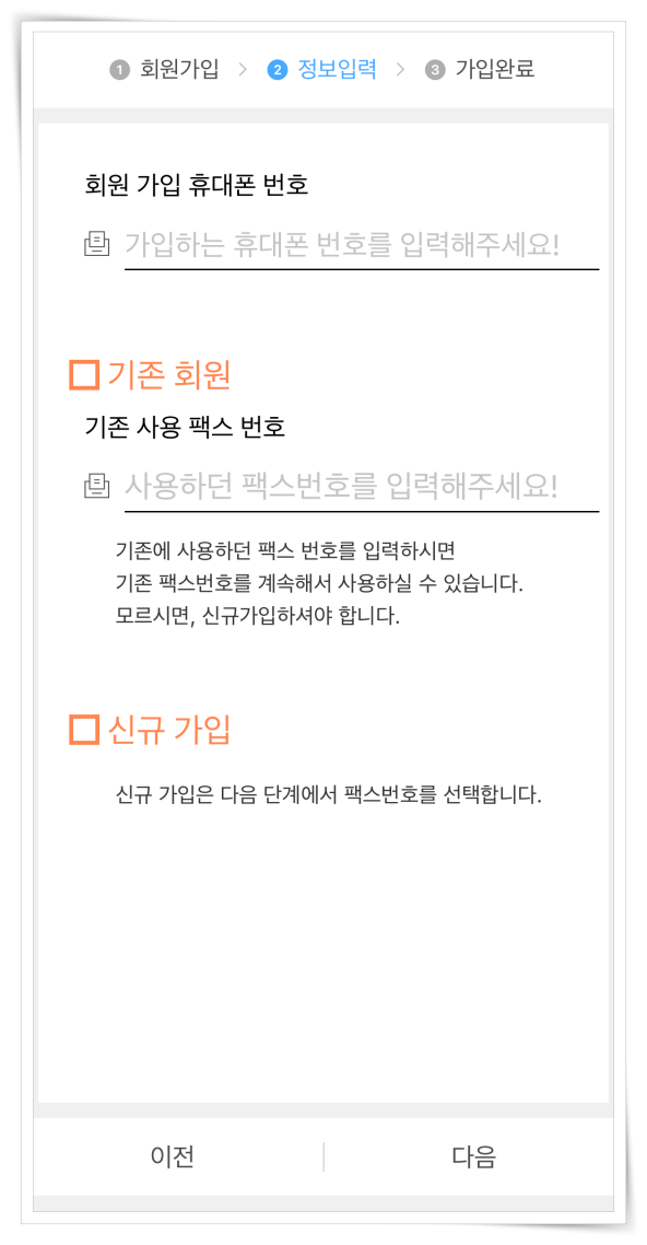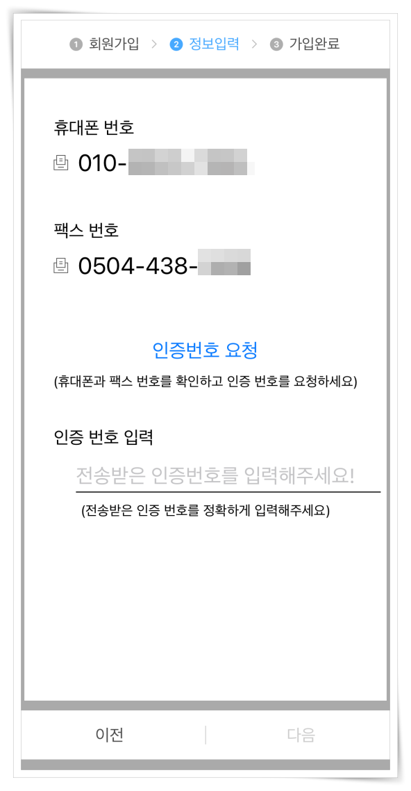 3. 휴대폰과 팩스 번호를 확인하고 휴대폰 인증을하면 가입이 완료됩니다.