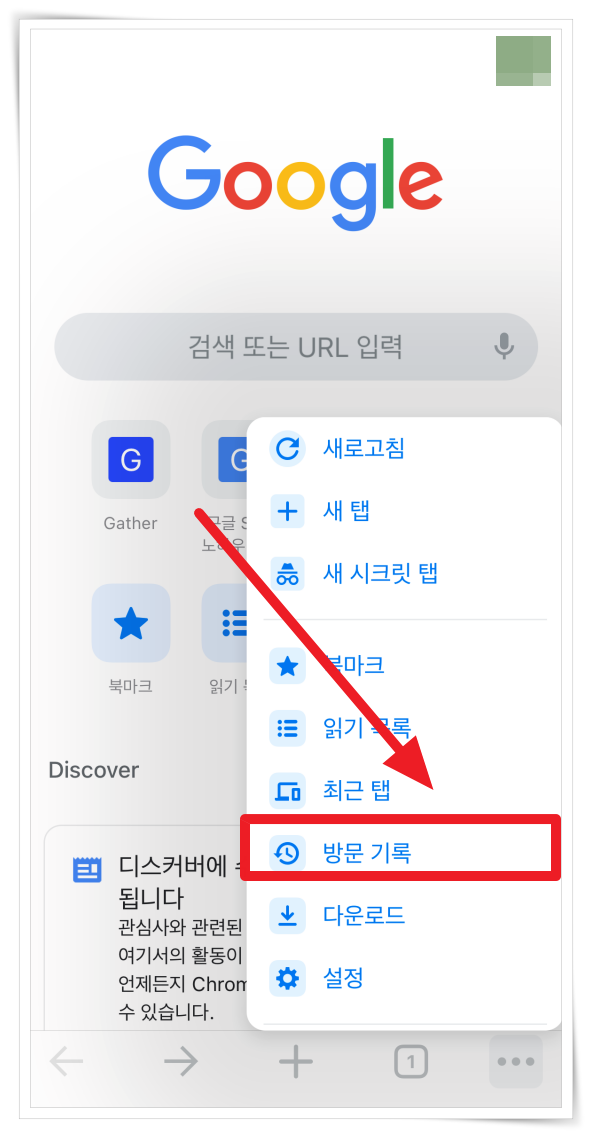 1. 구글 크롬 실행 후 하단 점 세개 메뉴에서 "방문 기록"을 클릭해 주세요.