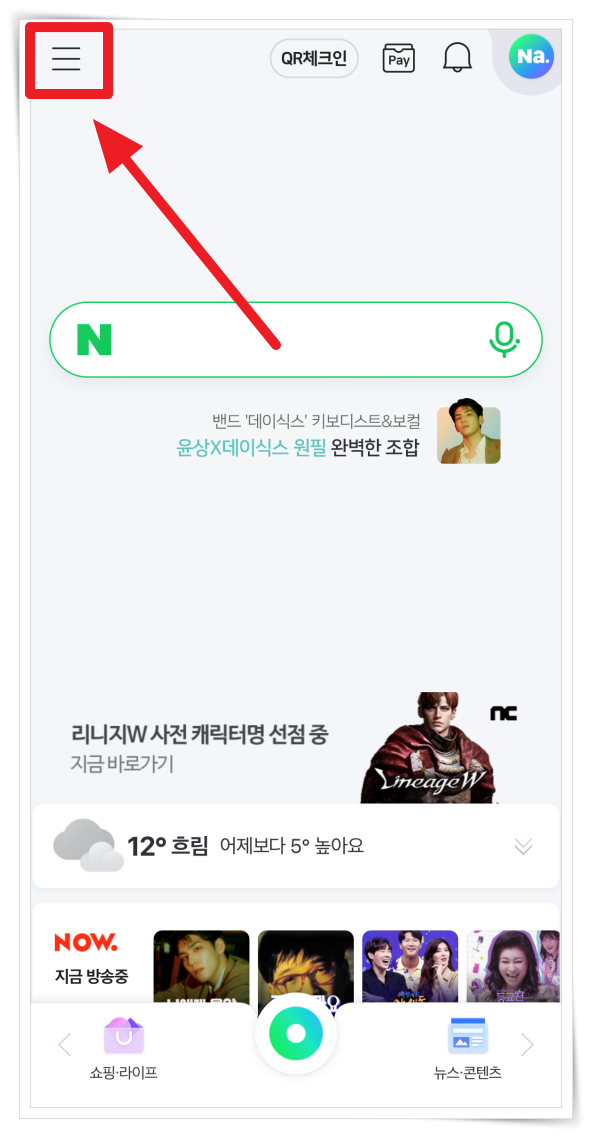 1. 네이버 앱 실행 후 좌측 상단 三 메뉴를 클릭해 주세요.