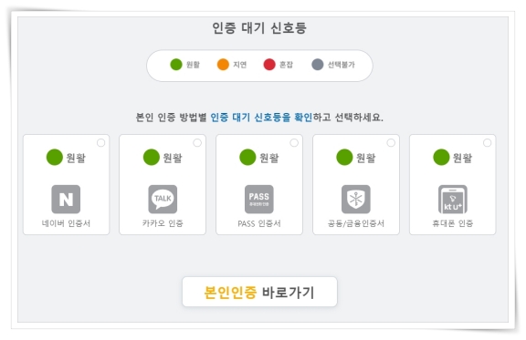 2. 인증 대기 신호등은 원활, 지연, 혼잡, 선택불가 등 4가지 색상으로 혼잡도를 확인할 수 있습니다. 원활한 인증 방법을 선택해서 "본인인증 바로가기"를 클릭해 주세요.