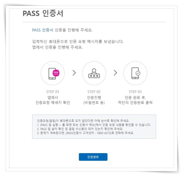 3. 대표적으로 PASS는 이름, 생년월일, 휴대폰번호 입력 후 "인증 요청"을 클릭하면 앱에서 비밀번호를 입력하여 인증하실 수 있습니다.