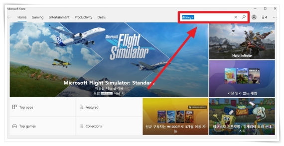 2. Microsoft store 실행 후 우측 상단 검색창에 "disney+"를 검색해 주세요.