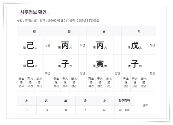 3. 결과를 보면 먼저 사주정보를 확인해 보실 수 있어요.